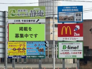 たとえば、秋田市内の南北に貫く国道13号線。地域で最も交通量の多い幹線道路のひとつで、1日に通過する車両はおよそ4万台になる交差点があります。単純計算すれば、1か月で約120万回、看板が“見られる可能性”があるということです。もちろん、すべての人が看板をしっかり読むわけではありませんが、視覚的に認知されるという点では極めて大きなインパクトがあります。